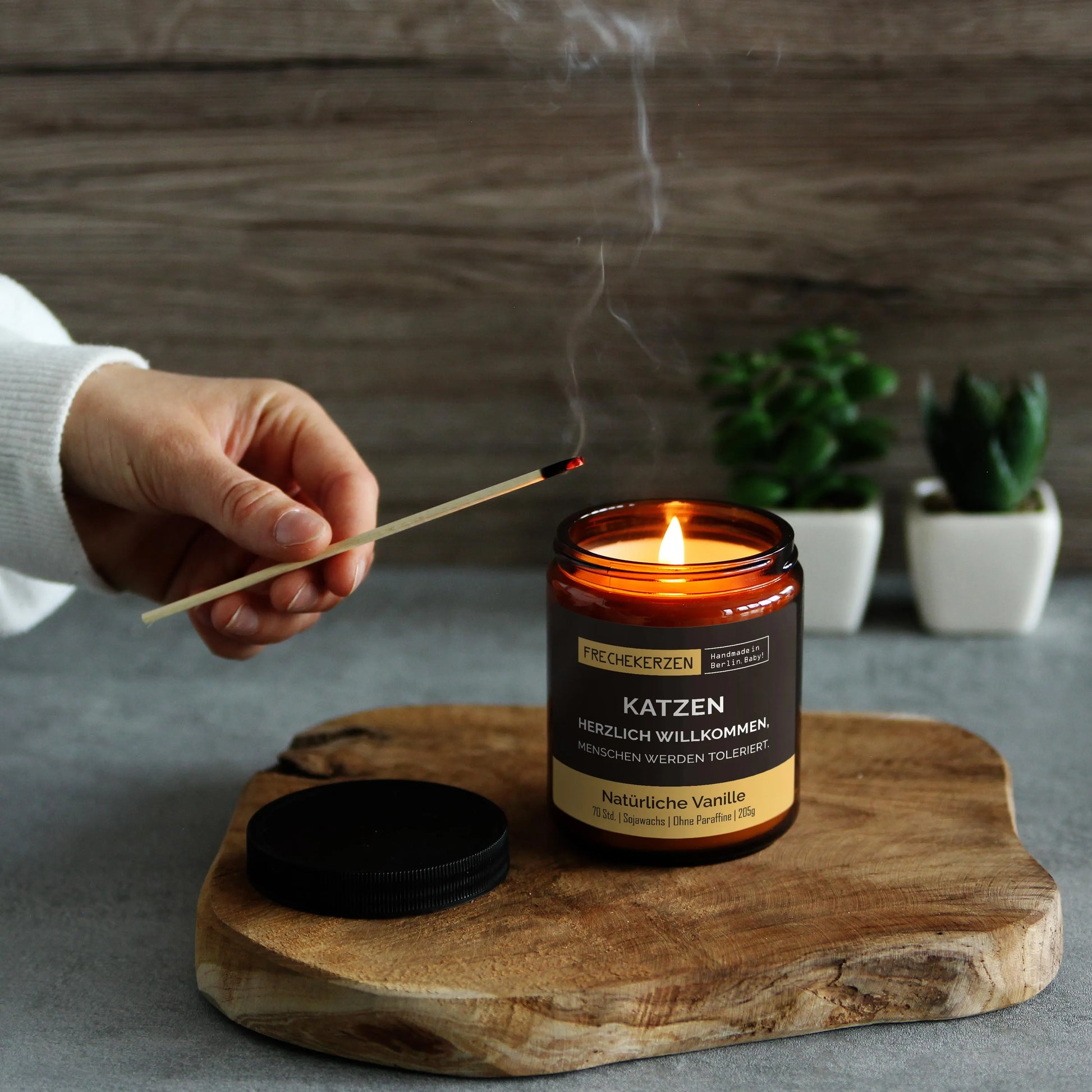 Das wiederverschließbare Glas bewahrt den Duft perfekt und der freche Spruch für Katzenfans macht die Kerze zu einem echten Blickfang.